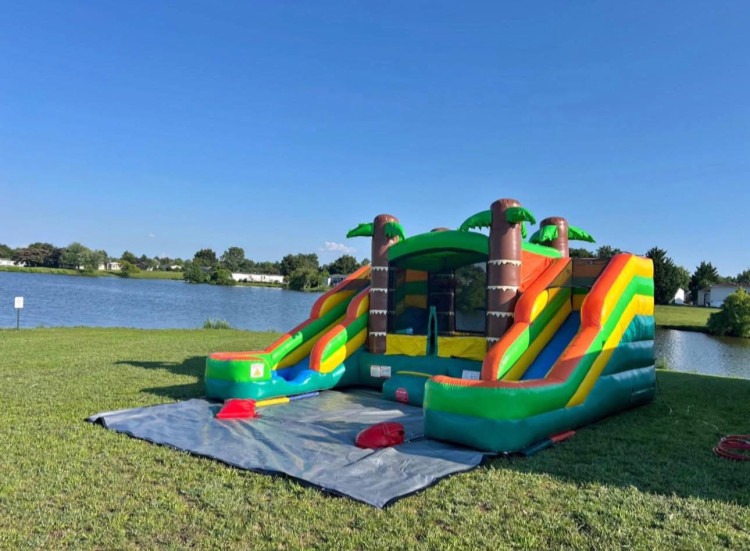 Palm tree themed dual slide bounce house. The slides can be used wet or dry. The unit measures 15 feet long, 16.5 feet wide, and 9.5 feet tall. Recommended for users 34-60 inches tall with a maximum weight capacity of 720lbs.